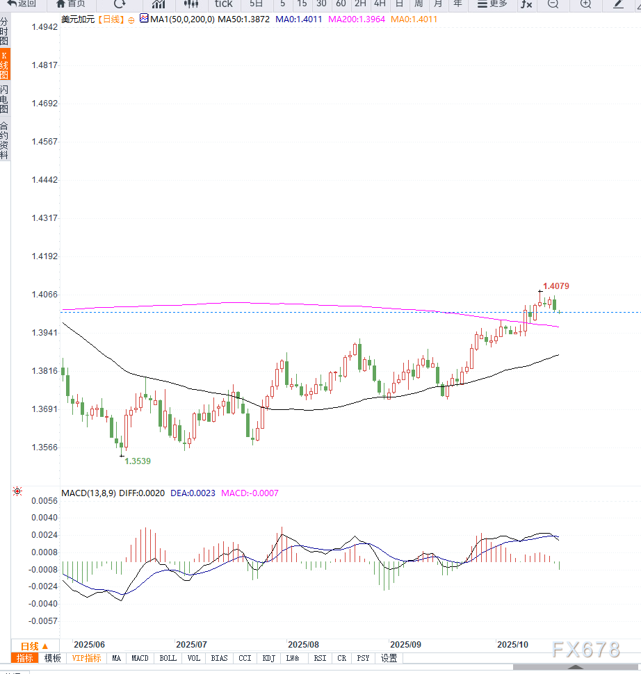 日线图显示应牛配,USD/CAD 在 1.4050–1.4070区间遇到阻力,多次未能突破,短线存在回调压力。下方支撑位集中在1.4000心理关口及1.3960–1.3950区域。