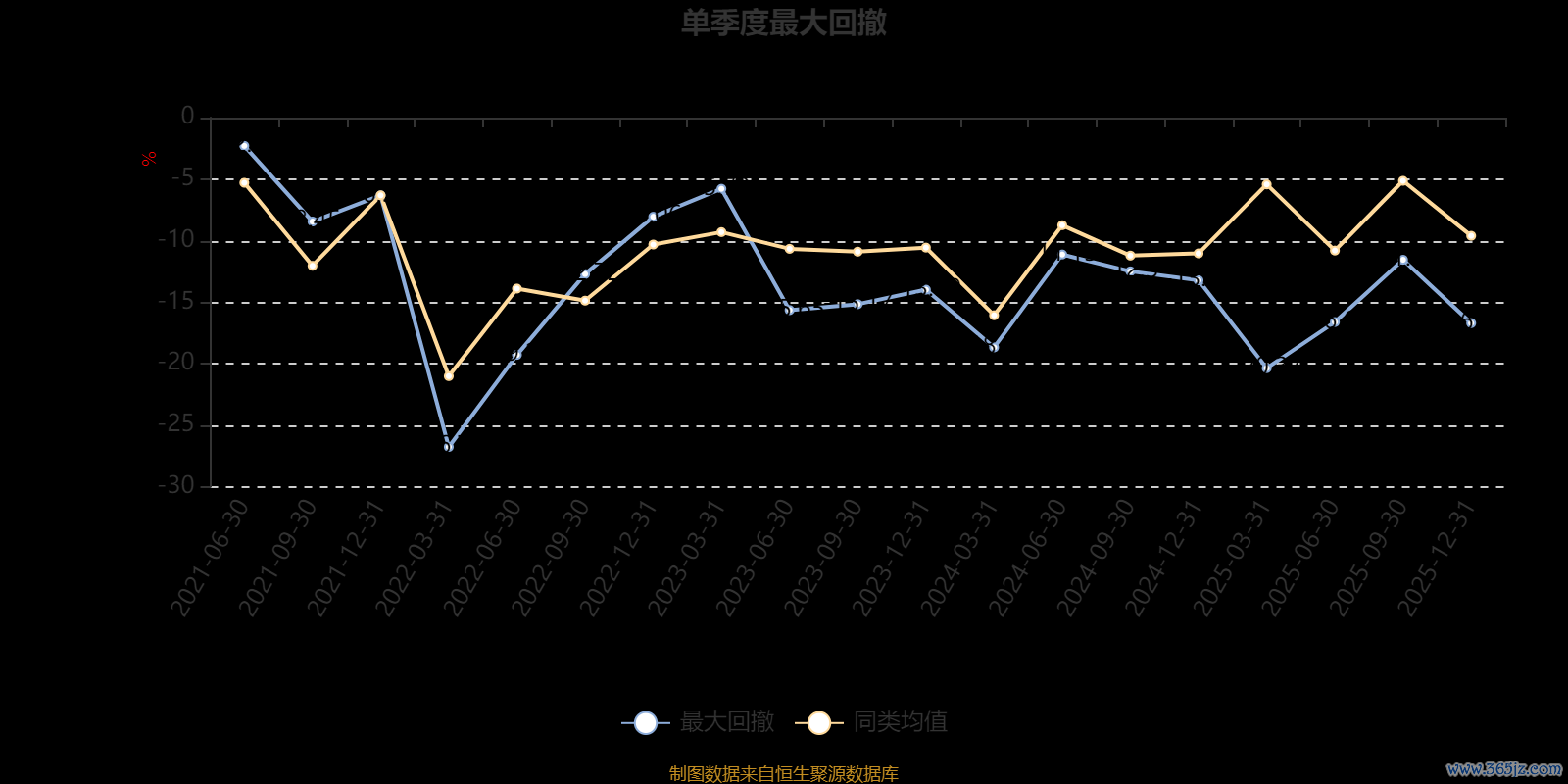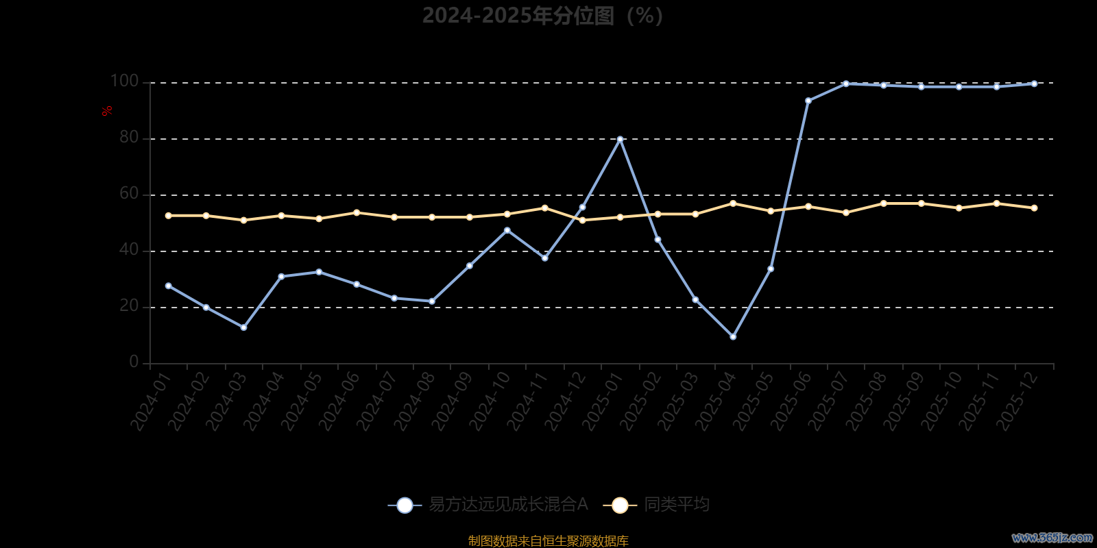 通过所选区间该基金净值增长率分位图,可以观察该基金与同类基金业绩比较情况。图为坐标原点到区间内某时点的净值增长率在同类基金中的分位数。