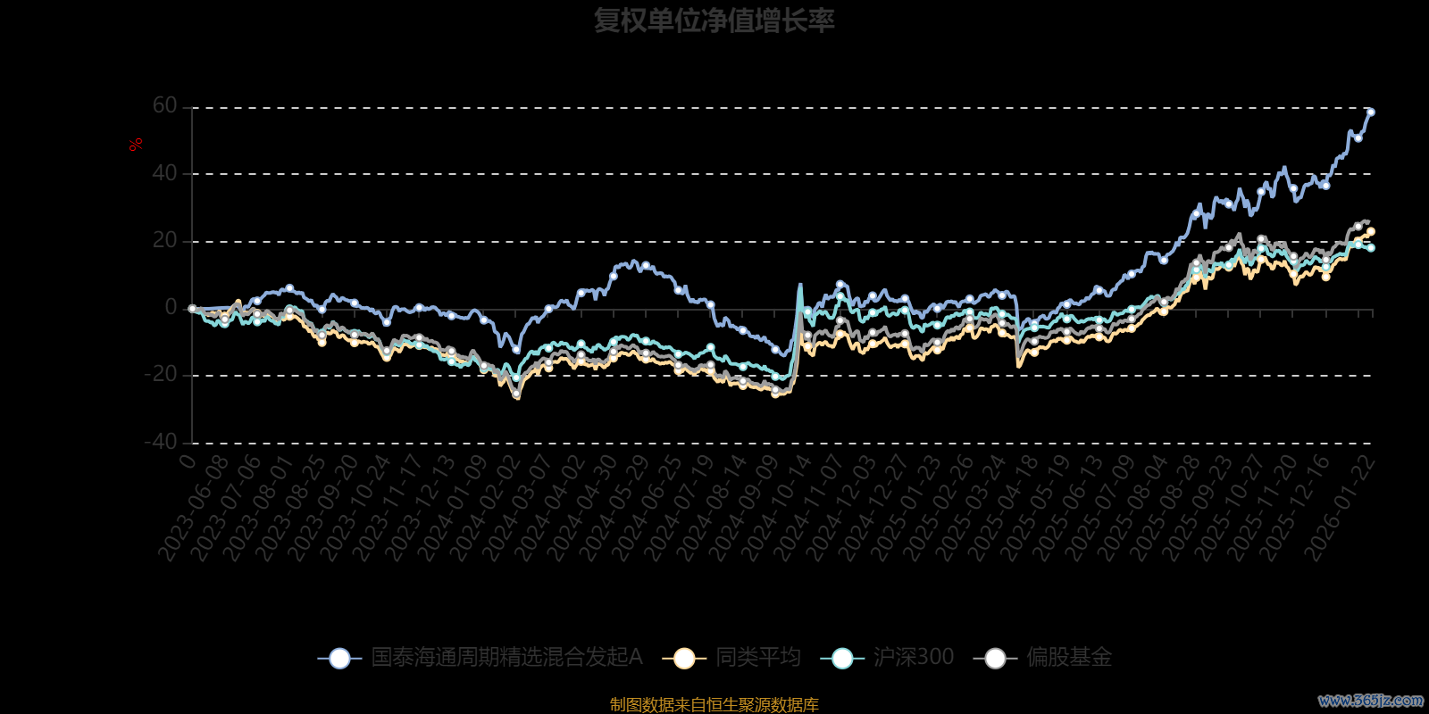截至1月22日,国泰海通周期精选混合发起A近三个月复权单位净值增长率为22.77%,位于同类可比基金50/689;近半年复权单位净值增长率为35.55%,位于同类可比基金178/689;近一年复权单位净值增长率为57.26%,位于同类可比基金129/673。